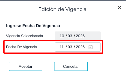 Cuando se quiera generar una nueva vigencia, se abrirá un pop up donde se podrá completar la fecha de vigencia:
