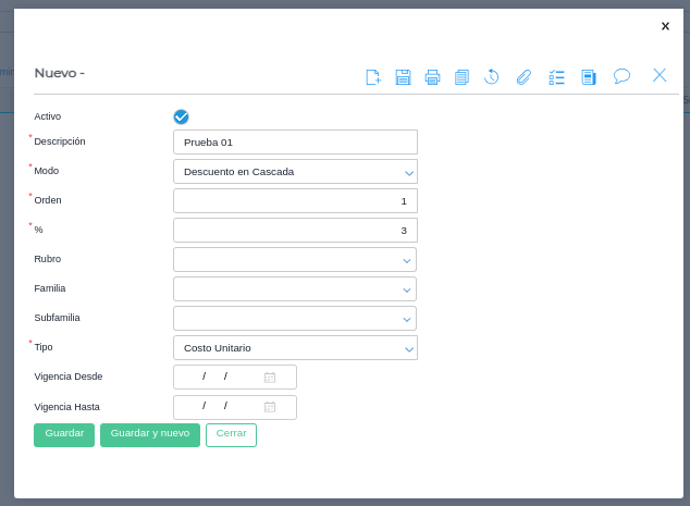 Familia: permite indicar una familia específica de productos a los cuales se les aplicará el descuento/recargo.