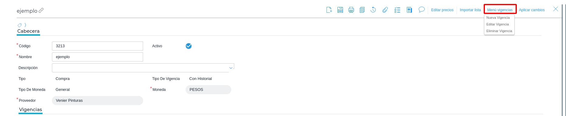 Una vez creada la lista de precios de compras del proveedor, si se configuró la misma “Con Historial”, desde el botón “Menú Vigencias” se puede agregar una nueva vigencia, editar o eliminar.