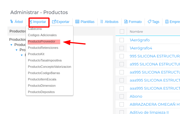 Una vez completados esos datos, guardar el excel y volver al sistema. Ir a la opción “Importar” → Producto/proveedor → Seleccionar el archivo → Aceptar.