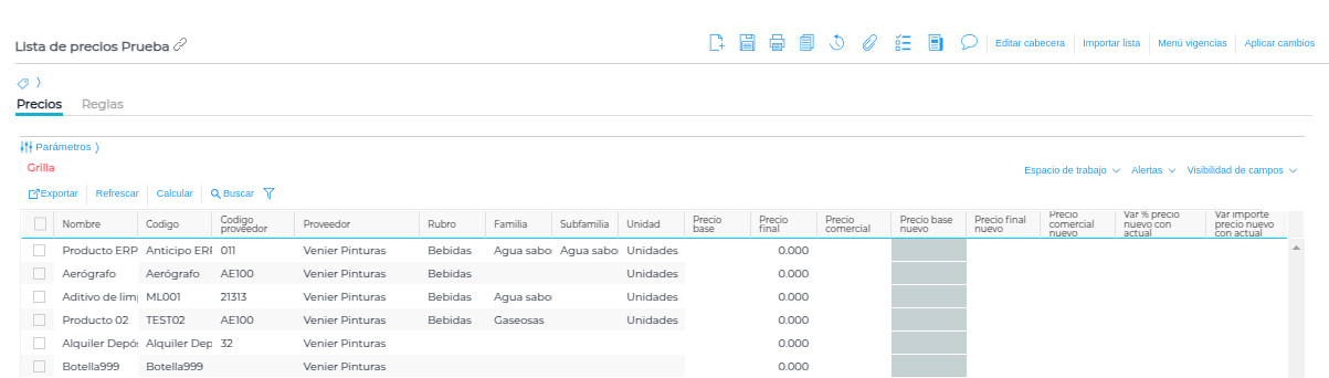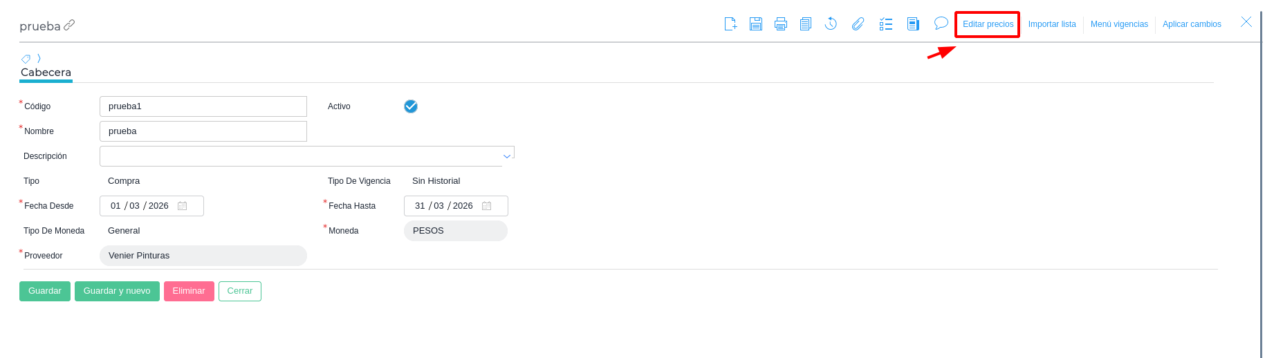 Una vez completa la cabecera, se debe guardar la lista para poder cargar los precios.