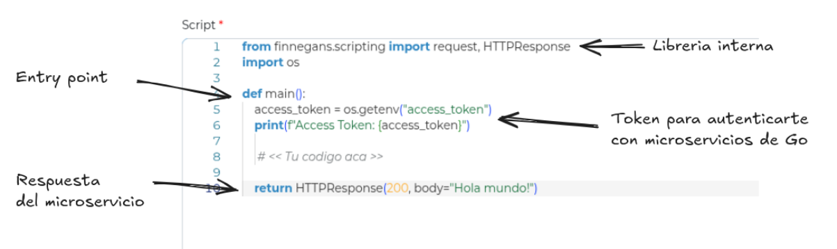 Es una aplicación de GO que permite a los usuarios crear scripts de Python de forma simple, sin necesidad de infraestructura externa. Estos scripts de Python se desarrollan directamente desde la plataforma y se ejecutan de forma temporal cuando son invocados. Cada script genera una URL única (conocida como “endpoint”) que puede ser utilizada por distintas herramientas del sistema Finnegans GO.
