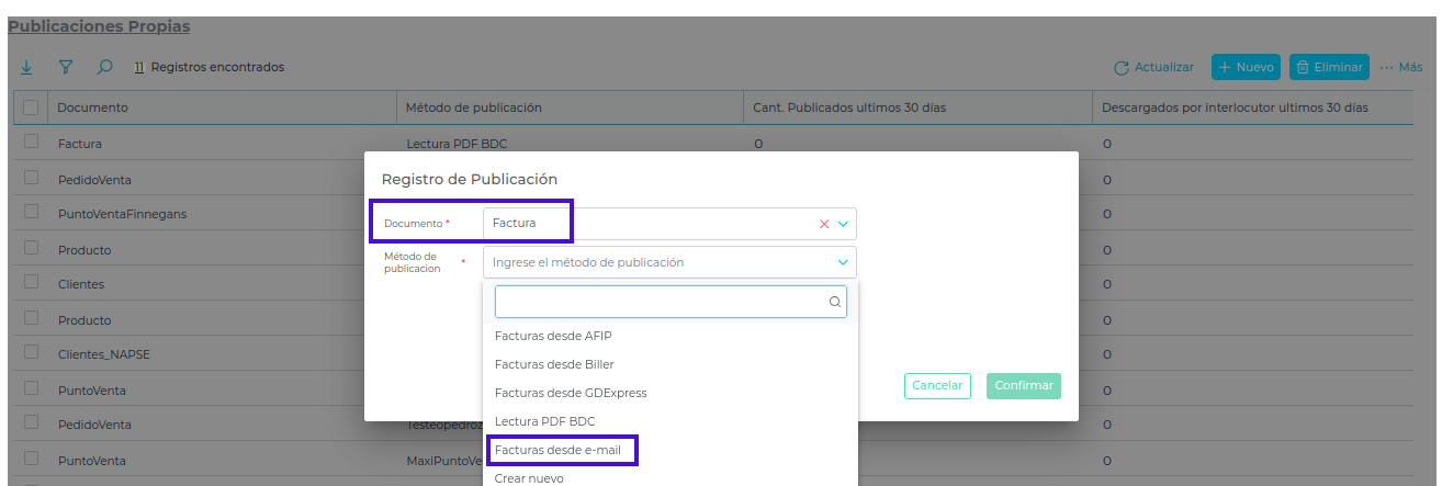 Ve a la sección de publicaciones y Agregar un Método público desde el boton +Nuevo: “facturas desde e-mail”.