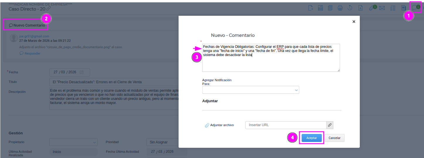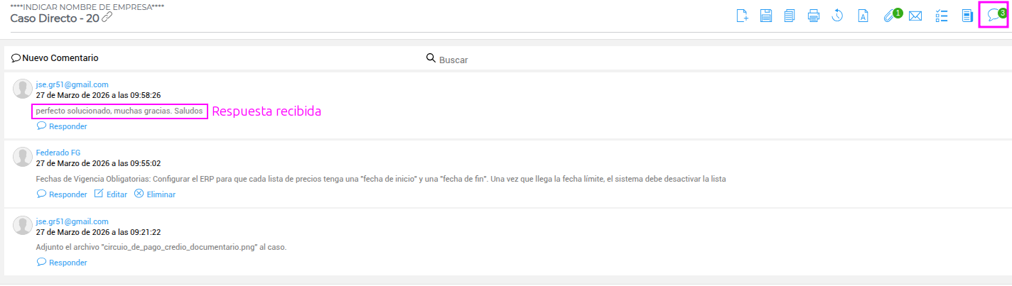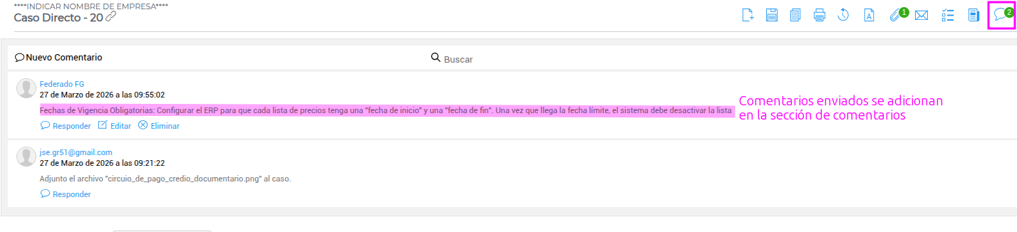 El flujo de comunicación se centraliza en la pestaña de comentarios: