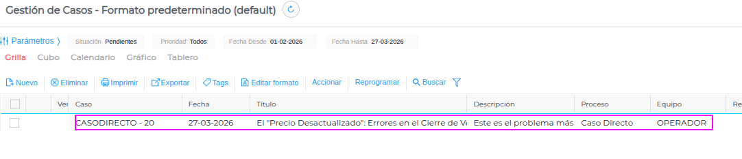 - Identificación: Localice el registro (ej. CASODIRECTO-20). En la grilla podrá visualizar de un vistazo el título, la fecha de ingreso.
