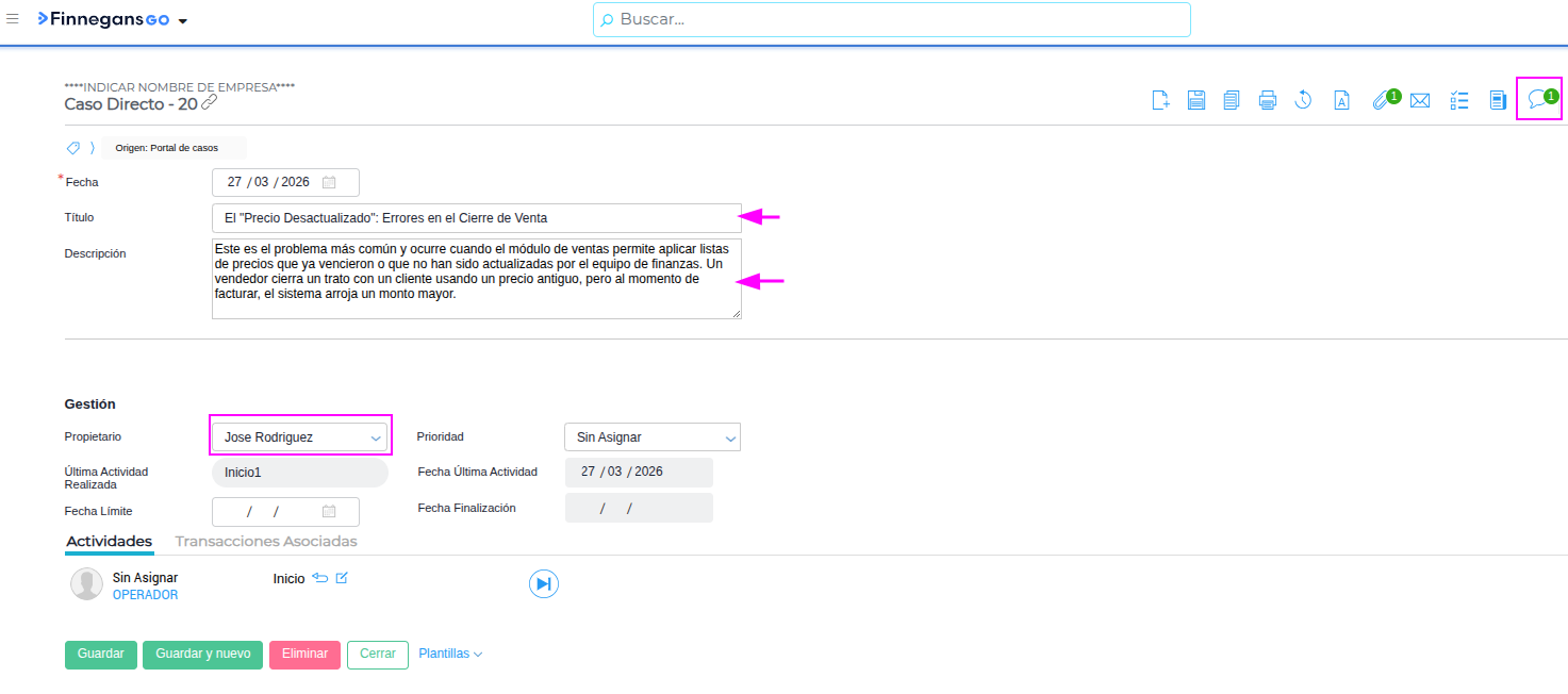 - Asignación de Responsable: En la sección “Gestión”, despliegue el campo Propietario y seleccione al consultor que se hará cargo de la resolución.
