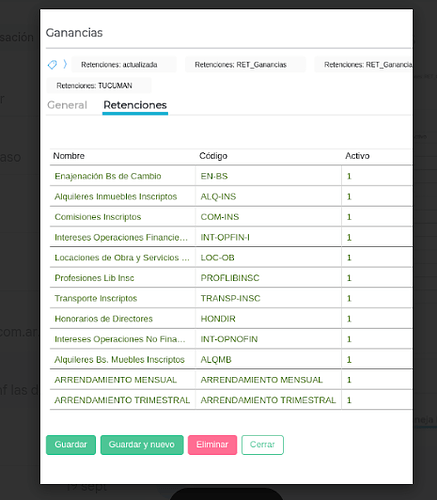 Al finalizar, la lista de retenciones de Ganancias debería mostrar los dos nuevos conceptos, “ARRENDAMIENTO MENSUAL” y “ARRENDAMIENTO TRIMESTRAL” , con sus respectivos códigos.