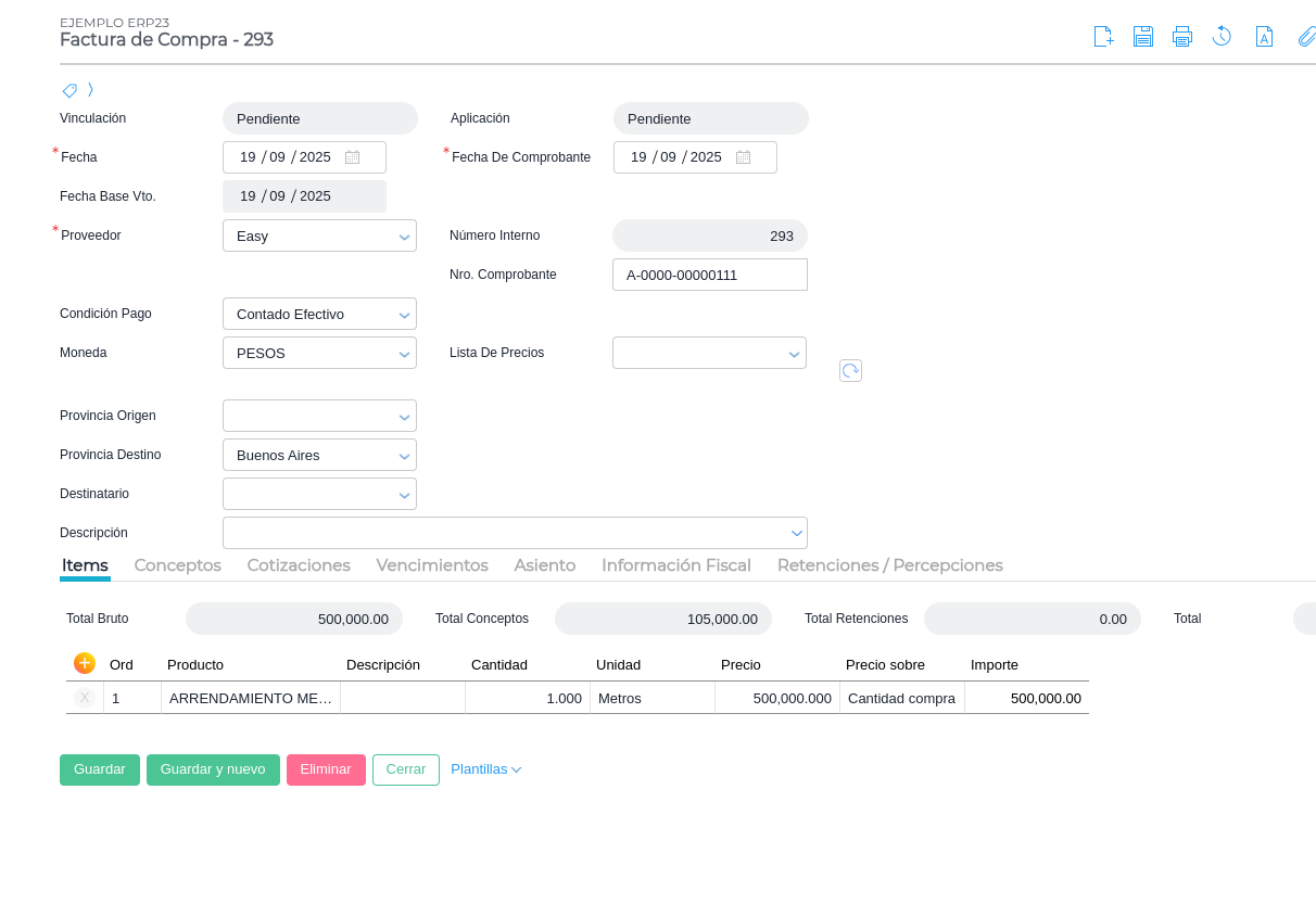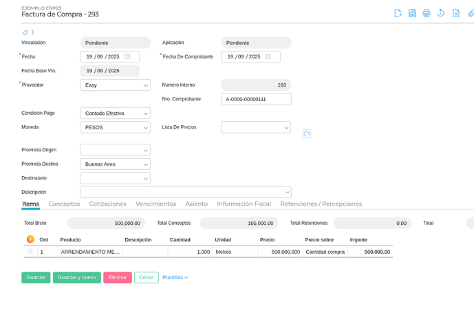 - Crea otra factura de compra, esta vez seleccionando el producto “ARRENDAMIENTO TRIMESTRAL” . El monto de esta factura debe ser superior al mínimo.