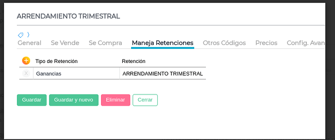 - En su pestaña “Maneja Retenciones” , agrega la retención de “Ganancias” y vincula el ítem “ARRENDAMIENTO TRIMESTRAL” .