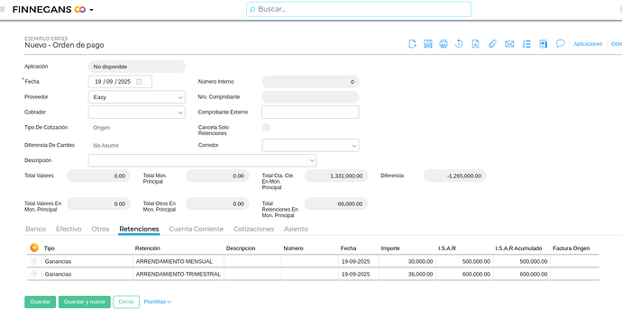 - En la pestaña “Retenciones” de la orden de pago, verás detalladas las retenciones de “ARRENDAMIENTO MENSUAL” y “ARRENDAMIENTO TRIMESTRAL” con los montos calculados.