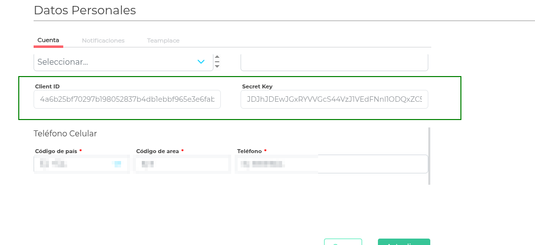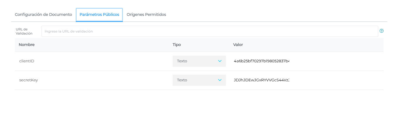 En la solapa Parámetros Públicos indicar clientID y secretKey. Estos valores se obtienen del perfil del usuario