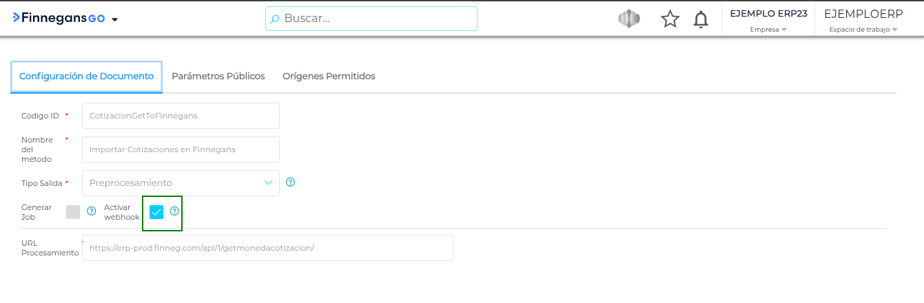 En la solapa Configuración del documento activar el checkbox “activar webhook”
