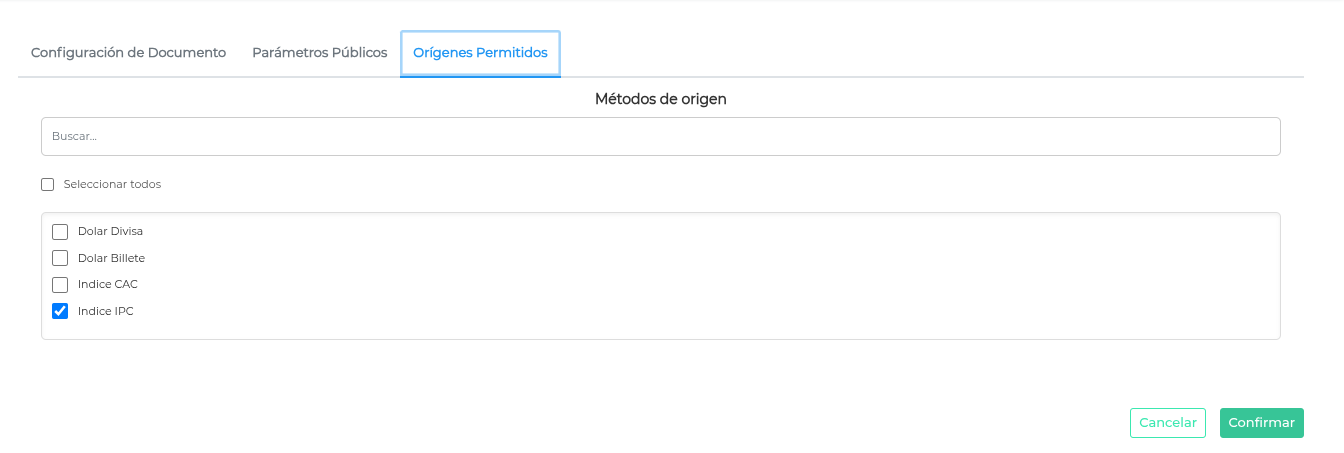 En la solapa Orígenes Permitidos, activar el Índice IPC