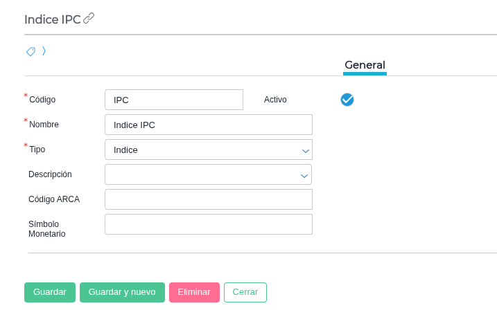 Debes asegurarte de que exista el índice con el código IPC , tal como se muestra en la configuración de Monedas (Tipo: Índice, Código: IPC )