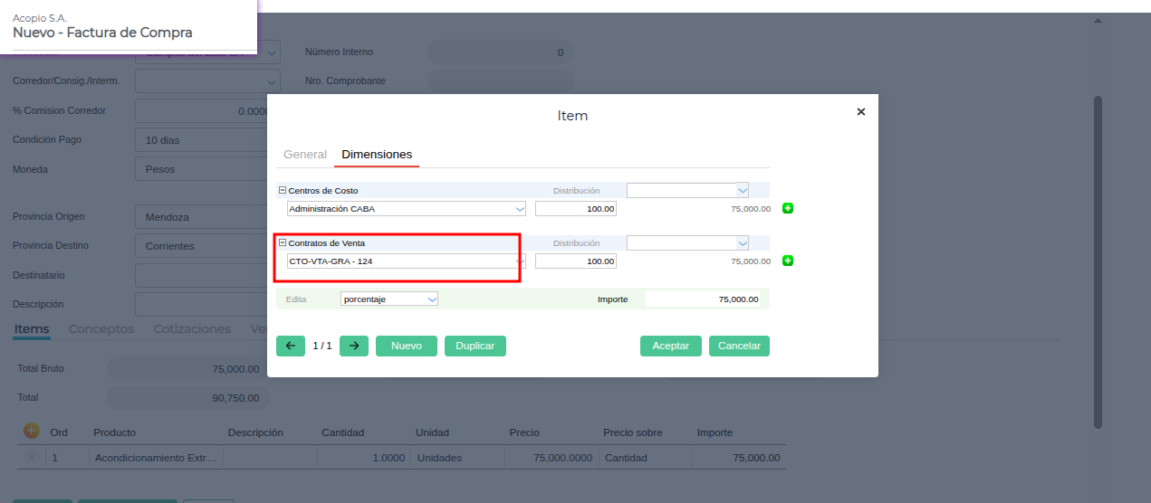 Luego, lo que se debe hacer es cargar la factura con el producto y cuando el sistema solicite la distribución de las dimensiones, se elija el contrato de venta de granos correspondiente.