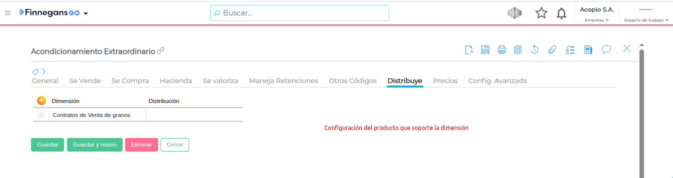 Para poder asociar una factura de compra con un contrato de venta de granos. Primero debe crearse una dimensión que sea “Contratos de Venta de Granos” y que esté referida a la tabla “Contrato Venta de granos”. Luego el producto que se utilice en la factura debe tener configurado que acepte la dimensión creada con anterioridad.