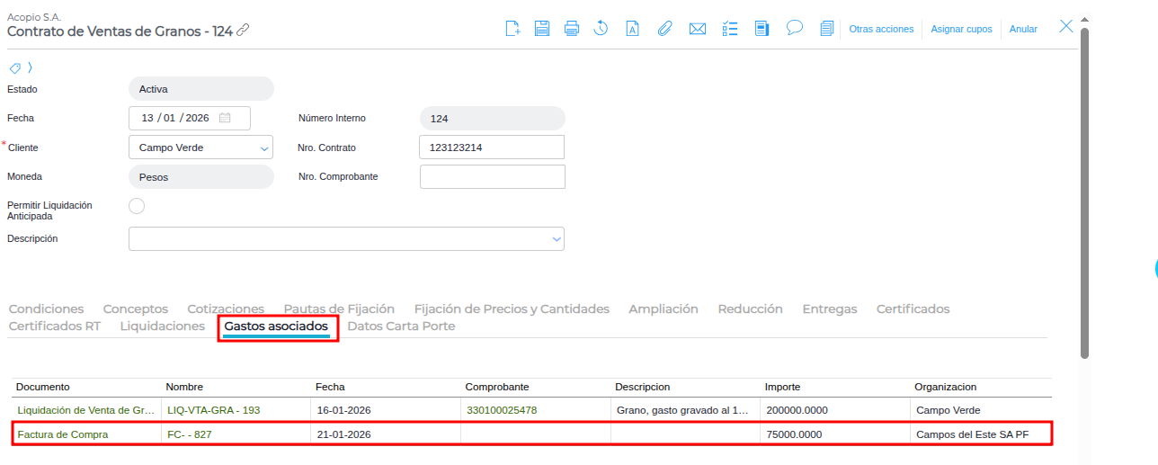 Por último, se verifica que la factura de compra queda asociada al contrato de venta, en la solapa Gastos Asociados.