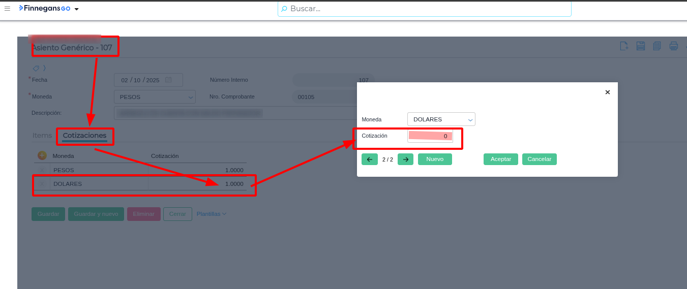 Se debe de ingresar a la transacción en donde se encuentra la discrepancia para poder ir a la solapa de “Cotizaciones” y cambiar la cotización de la Moneda Dólares de 1 a 0