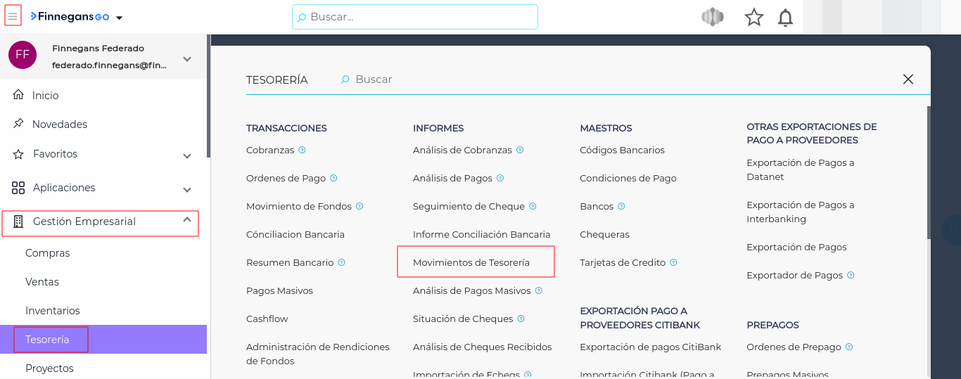 - Ingrese al informe desde Menu>Gestion empresarial>Tesoreria> Informes.