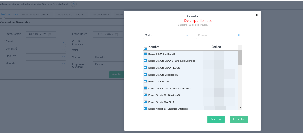 Seleccione las cuentas contables específicas que desea incluir en el informe, las mismas seran de disponibilidad: