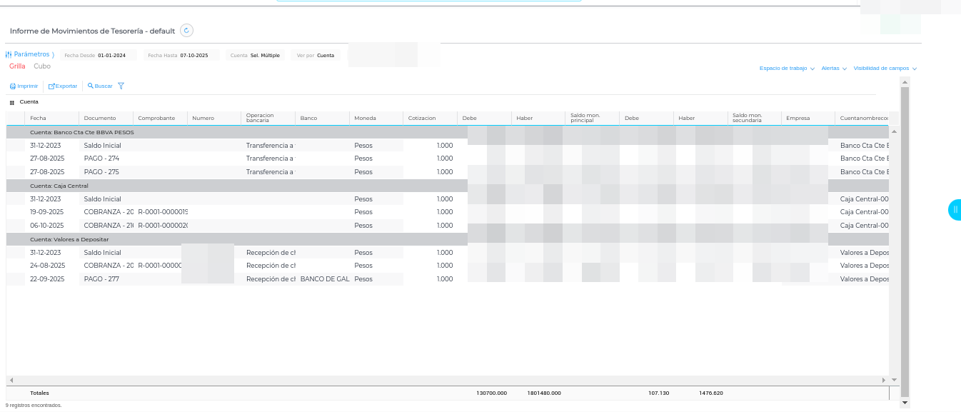 Para generar el Informe de movimientos de tesorería, es necesario configurar los siguientes parámetros obligatorios: