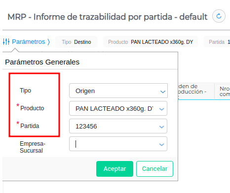 - Completar los parámetros de búsqueda: seleccionar Tipo (Origen o Destino), Producto, Partida y Empresa/Sucursal.