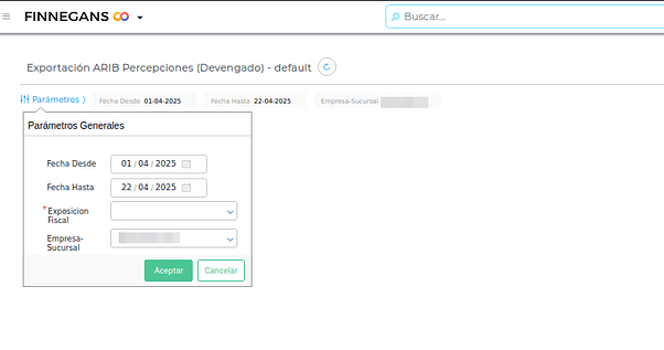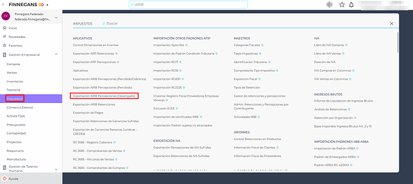 Menú → Gestión Empresarial → Impuestos → Aplicativos → Exportación ARIB Percepciones (Devengado)