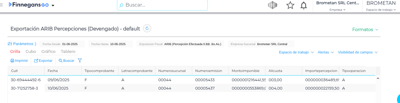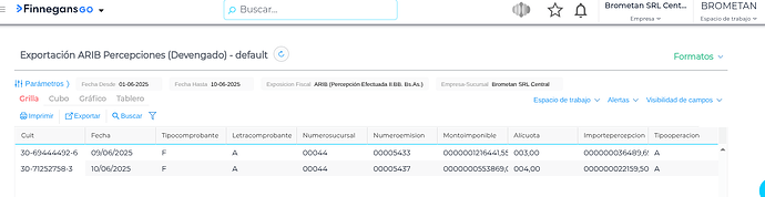 Para configurar y realizar la exportación ARIB de percepciones de Ingresos Brutos (IIBB) bajo el método devengado, se debe acceder a la funcionalidad del sistema y completar los parámetros requeridos. Esta operación permite generar un archivo en formato TXT con los datos necesarios para presentar ante el organismo fiscal correspondiente.
