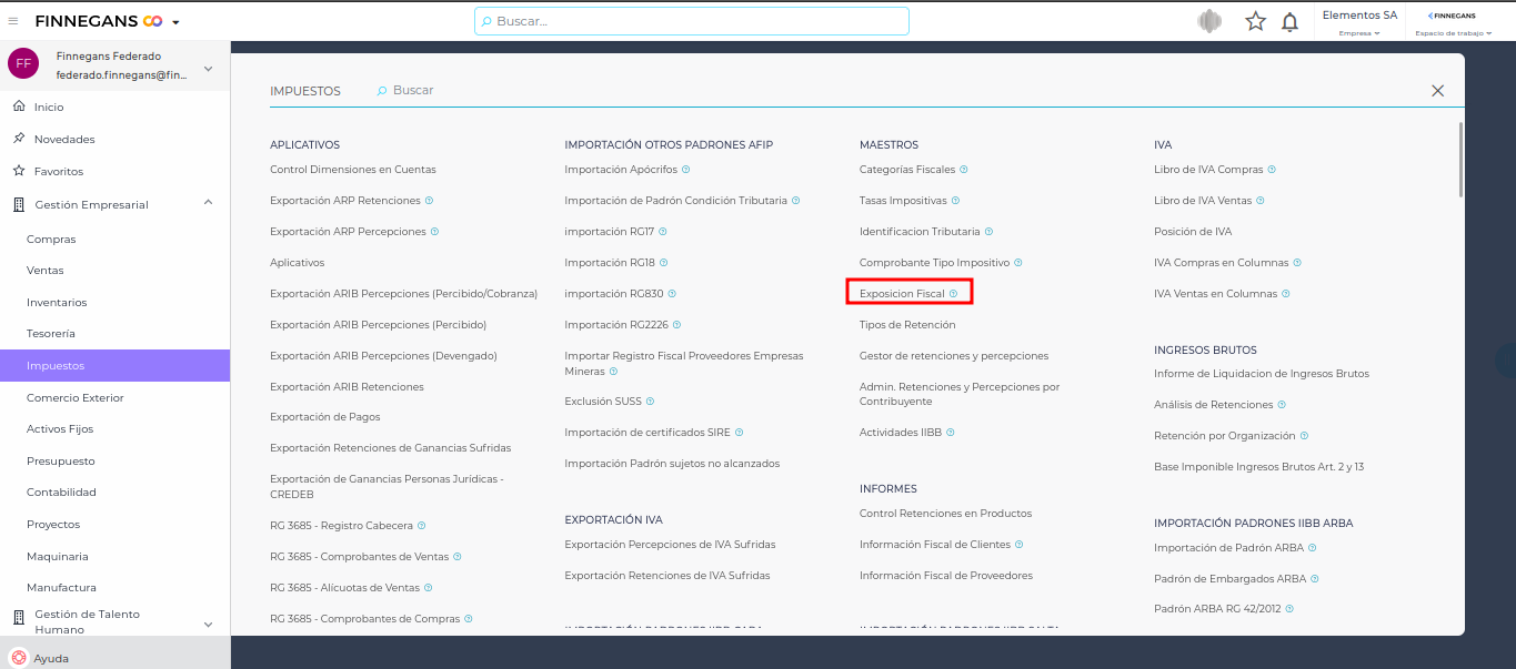 Para acceder, clic en Gestión empresarial → Impuestos → Maestros → Exposición Fiscal