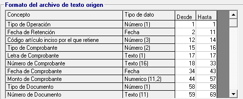 - Tipo de operación: Ocupa la primera posición. Siempre se informa 1 si se trata de Retención o 2 si se trata de Percepción.