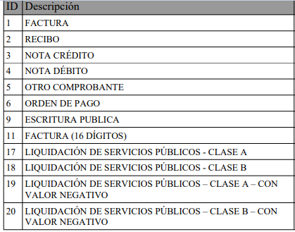 Tipo comprobante: mostrará los códigos de comprobante según la siguiente lista de AFIP:
