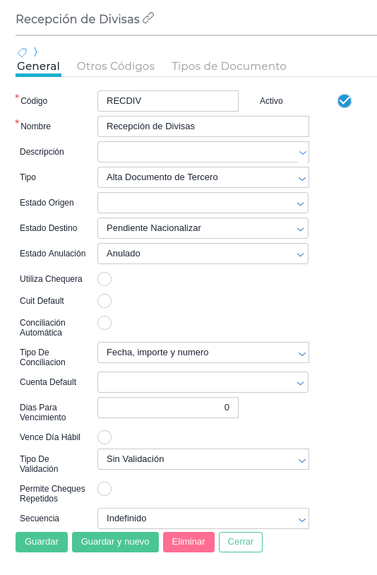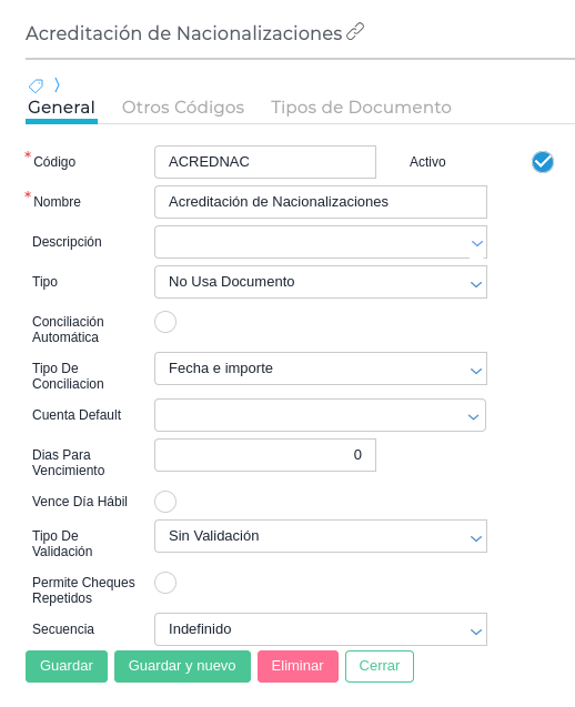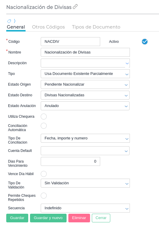 Nacionalización, la configuración es la misma que Depósito de un Cheque de tercero, pero el tipo debe ser Usa Documento Existente Parcialmente.