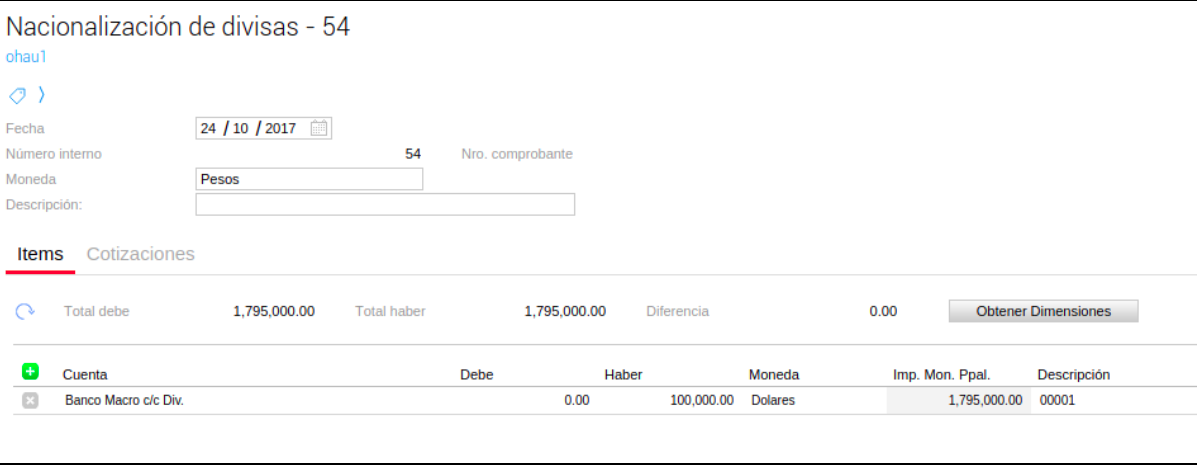 En el siguiente ejemplo se realizará una nacionalización parcial de USD 100.000 a una cotización de ARS 17,95