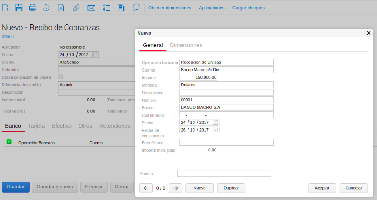 El primer paso del circuito será la registración de una cobranza utilizando la operación bancaria Recepción de Divisas: