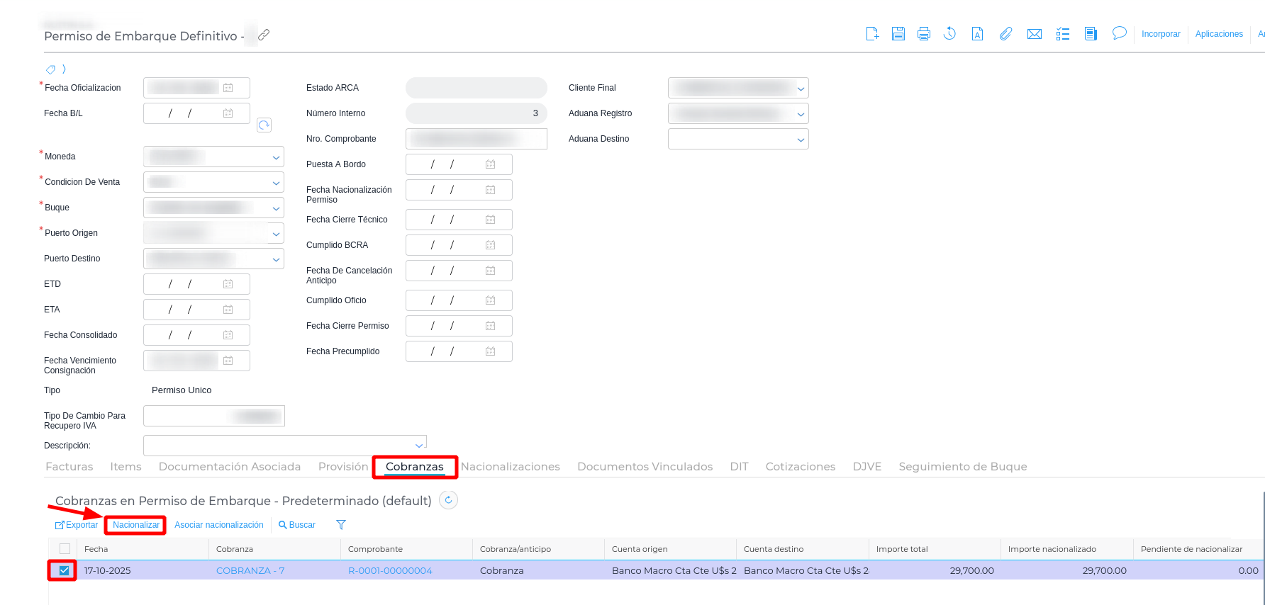Para lo cual habrá que dirigirse a la solapa cobranzas, tildar la cobranza en cuestión y hacer click en Nacionalizar.