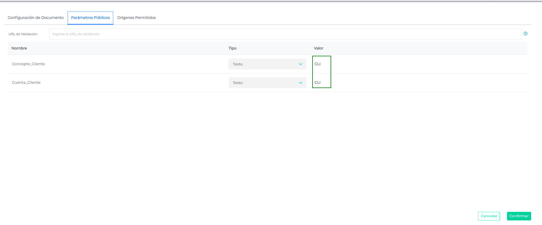 Solapa “Parámetros Públicos”: los parámetros “Concepto_Cliente” y “Cuenta_Ciente” vienen datos por defecto, el campo “Valor” es configurable. Estos datos se deben tomar de los Maestros “Conceptos de Organizaciones” y “Cuentas”, respectivamente: