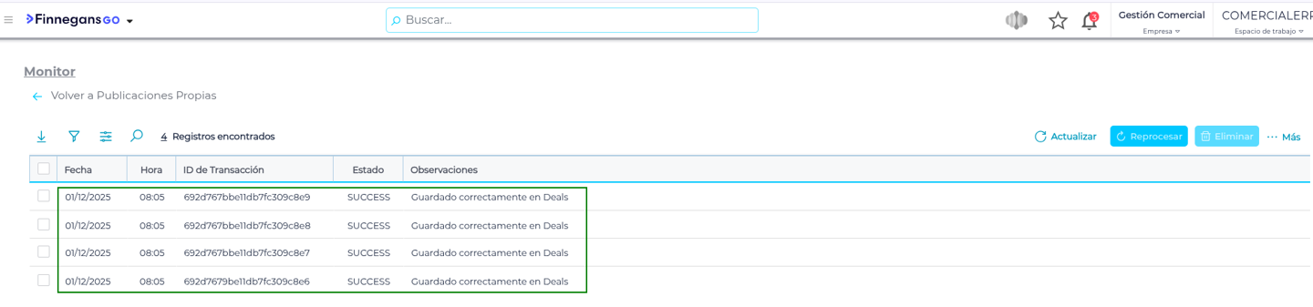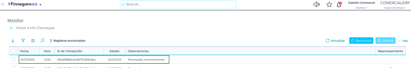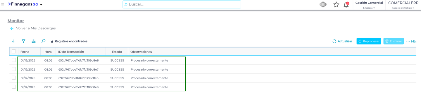 - Si los registros ingresan bien a Finnegans, se debe visualizar en la columna “Estado” el valor SUCCESS.