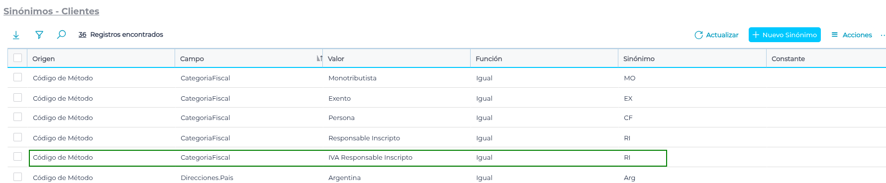 Campos disponibles del JSON “Clientes” para ser configurados como Sinónimos: