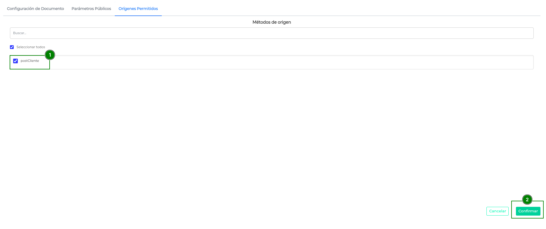 Solapa “Orígenes Permitidos”: se selcciona el código del método de publicación anteriormente configurado: