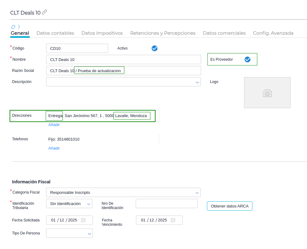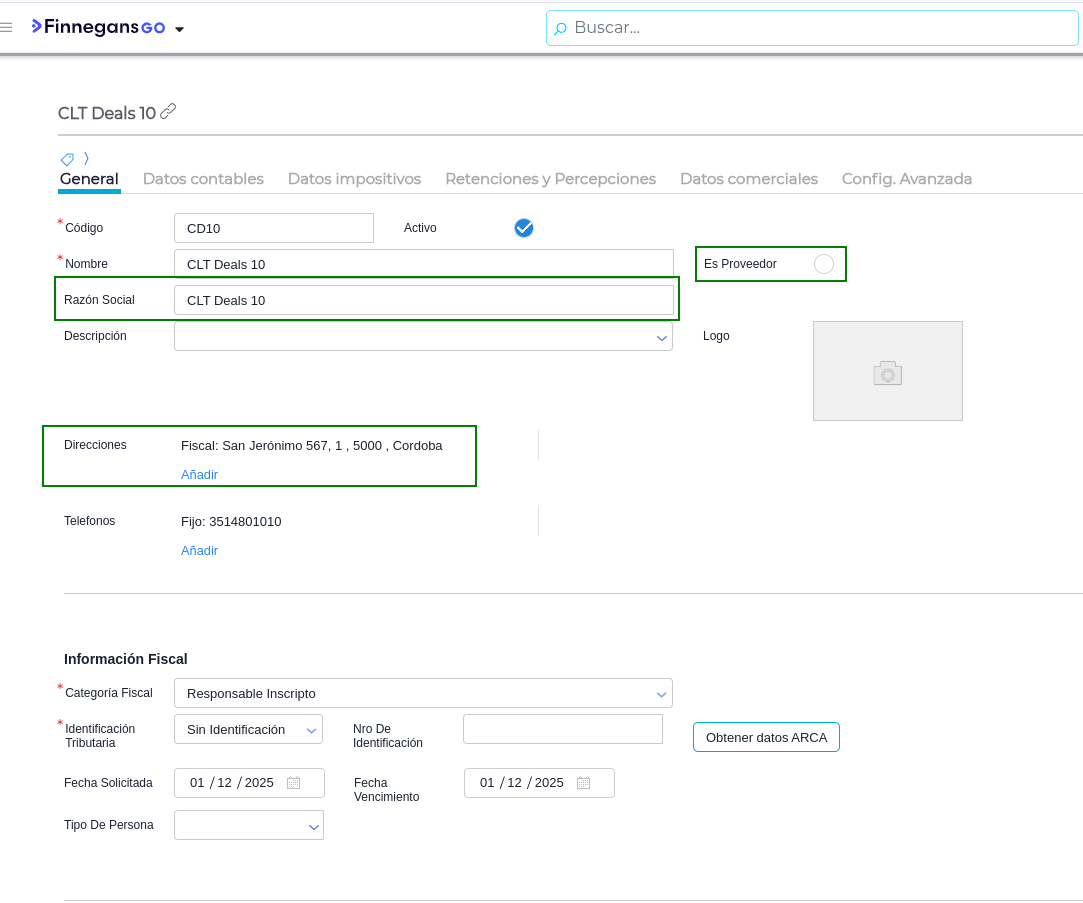 Al completar los campos País, Provincia, Localidad y DirecciónTipo, estos se visualizan de la siguiente manera en el detalle del Cliente dentro del Maestro en Finnegans: