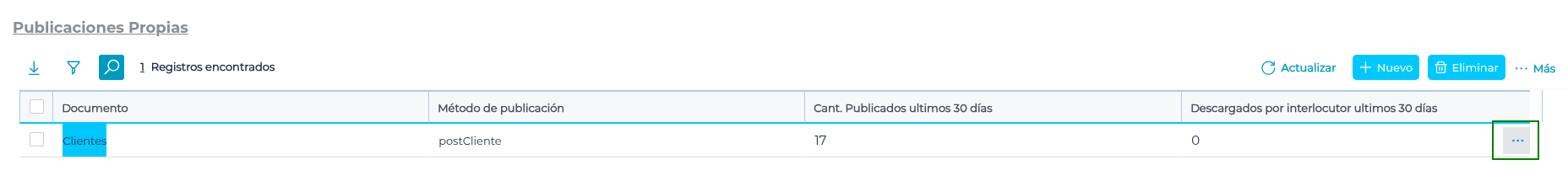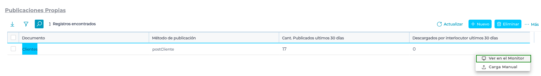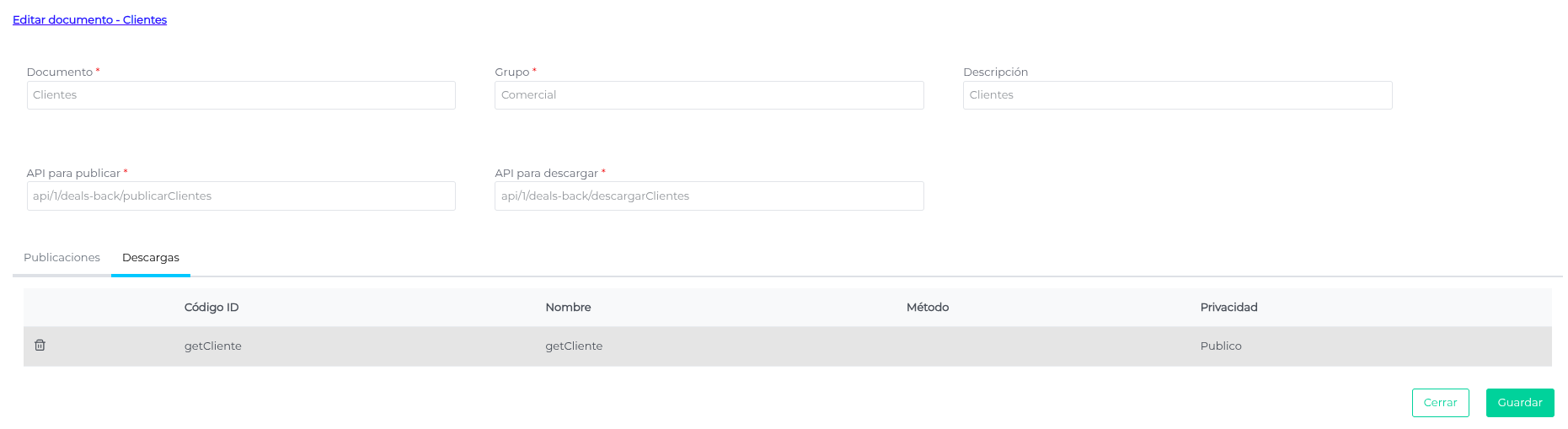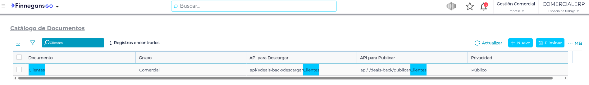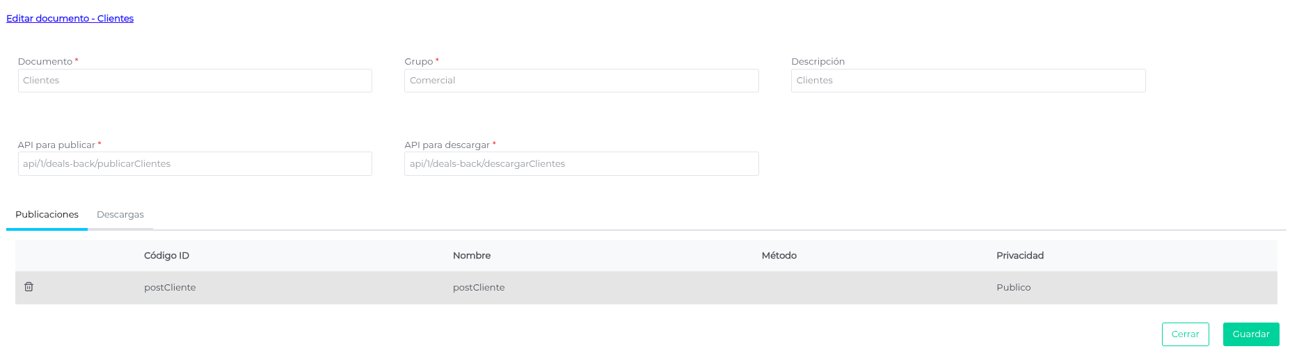 - Presionando el botón “Nuevo”, completando el campo “Documento = Clientes” y “Metodo de Publicacion = getCliente” se crea el registro de integración.