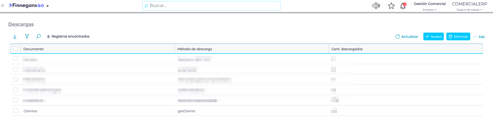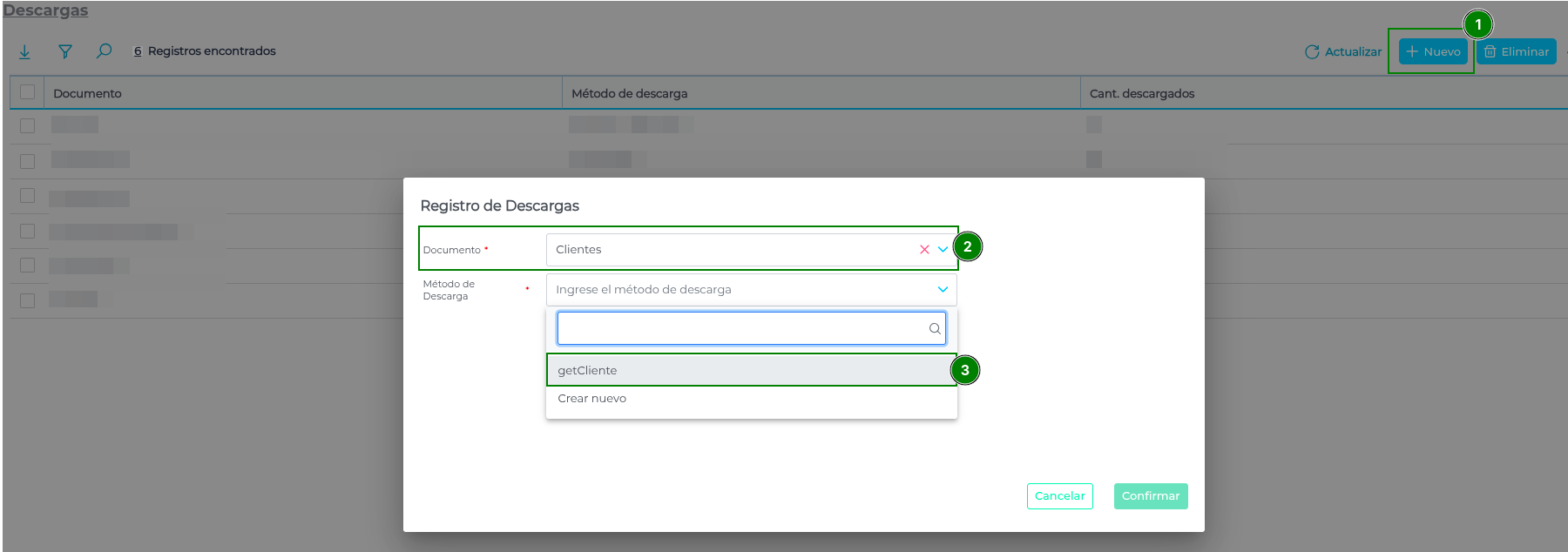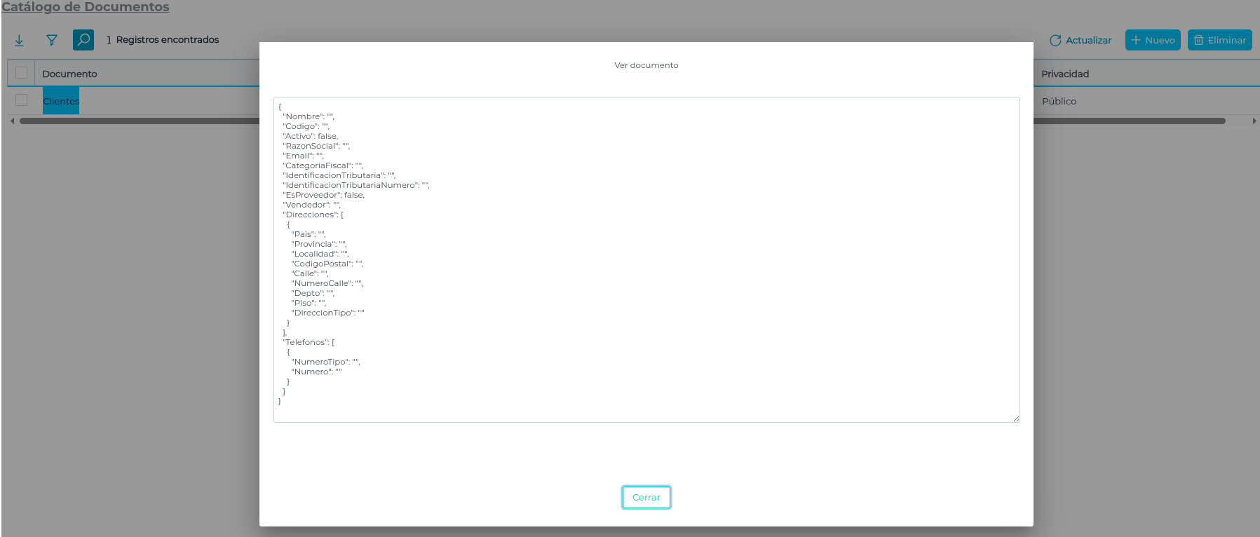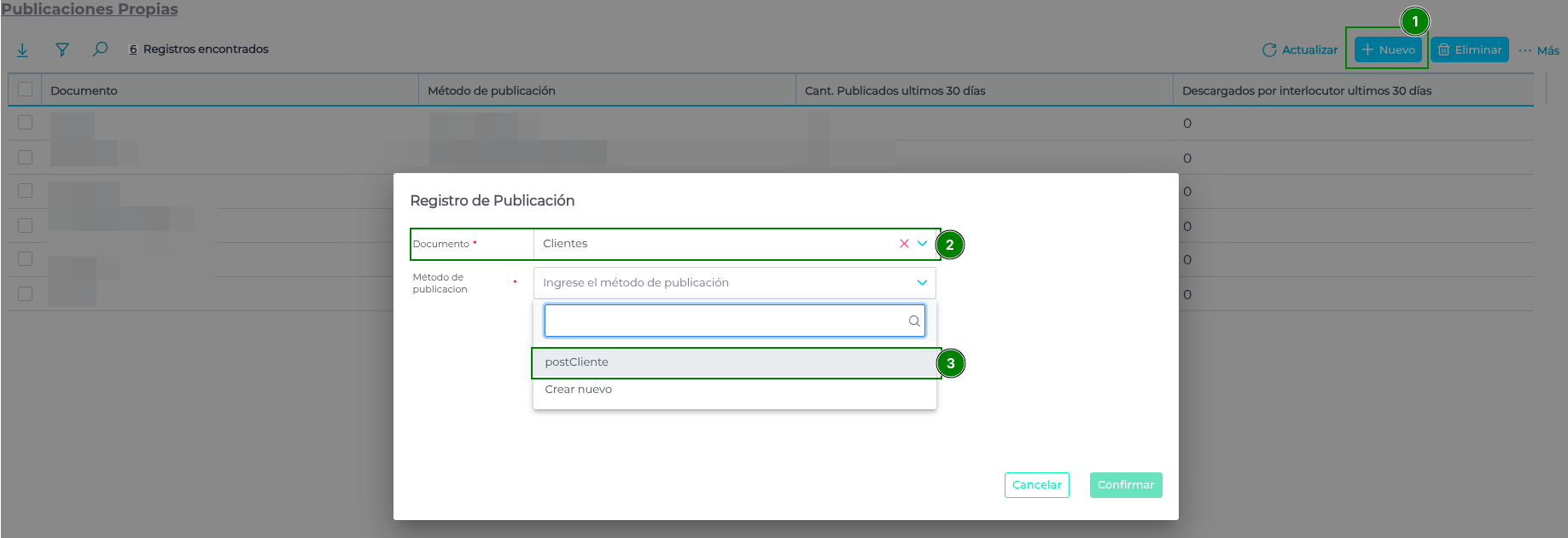 - Presionando el botón “Nuevo”, completando el campo “Documento = Clientes” y “Metodo de Publicacion = getCliente” se crea el registro de integración.