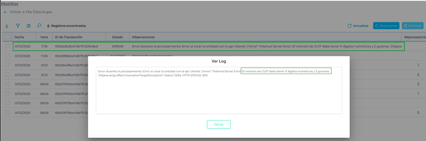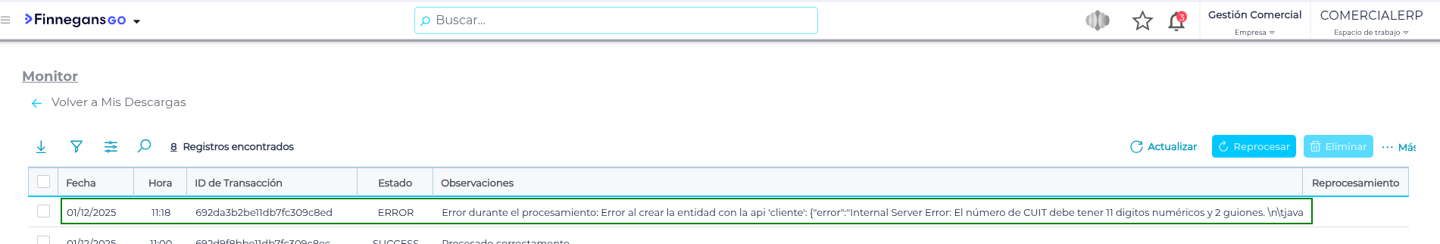 - Si el registro quedó con error y no pudo ingresar a Finnegans, se debe visualizar en la columna “Estado” el valor ERROR.