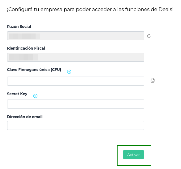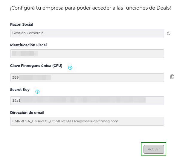 Como primer paso se debe activar la Empresa en Deals. Si la empresa no está activada, no se dispondrá del CFU (Clave Única Finnegans), la cual es esencial para enviar información y realizar operaciones dentro de Deals.