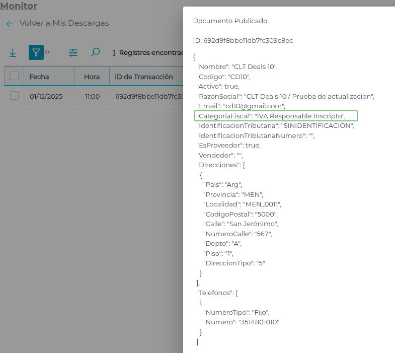 - También se observa que para el campo “CategoriaFiscal”, se envía el dato "“IVA Responsable Inscripto” y como se valida en el siguiente punto, en el monitor de “Mis Descargas”, el envío de información al ERP fue correcto, por lo que se aplicó el sinonimo “RI”.