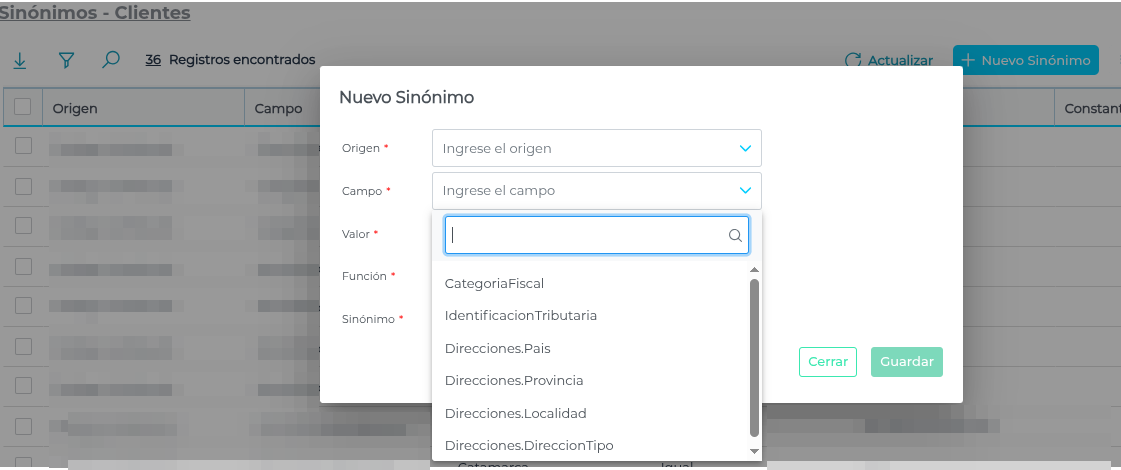 Se puede hacer más de una configuración de sinónimo por campo. Esto permite que cuando Deasl reciba información distinta a la disponible en los maestros del ERP, se transforme el dato y se realice el envío de forma correcta.