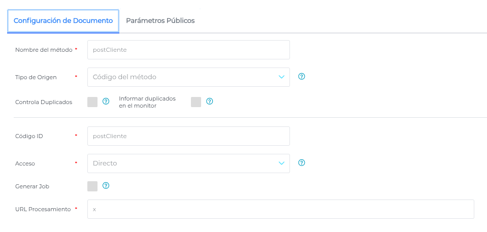 - Presionando el botón “Nuevo”, completando el campo “Documento = Clientes” y “Metodo de Publicacion = postCliente” se crea el registro de integración.
