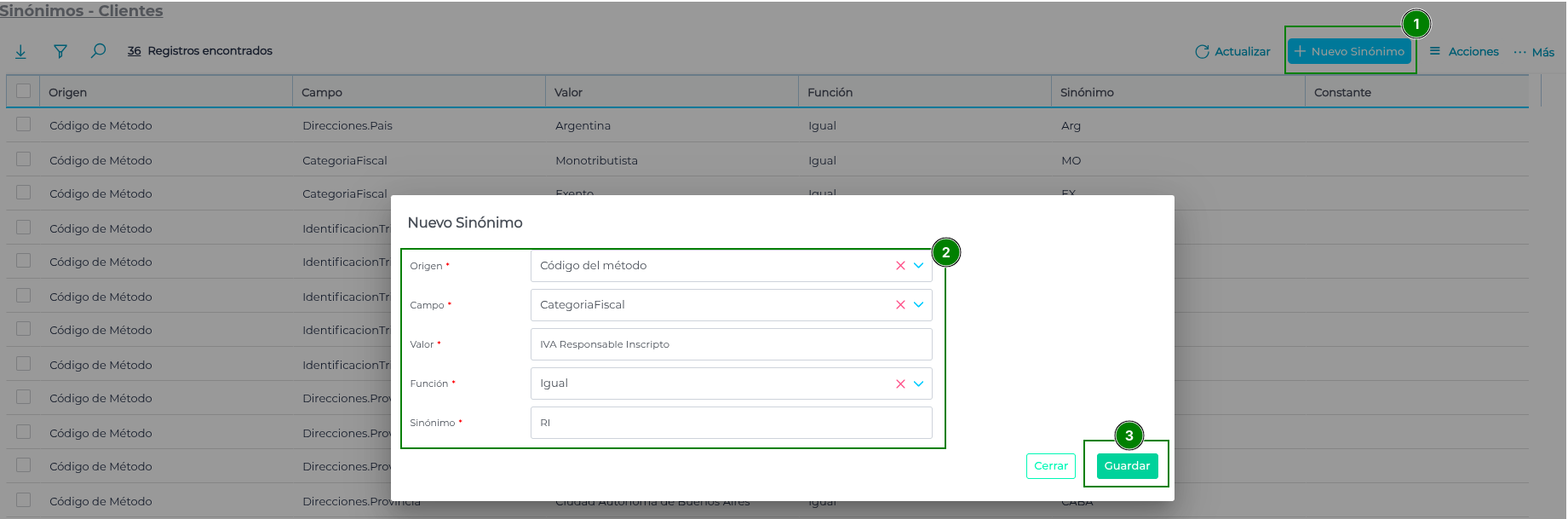 Presionando el botón “Nuevo Sinónimo” y completando los campos de la siguiente forma:
