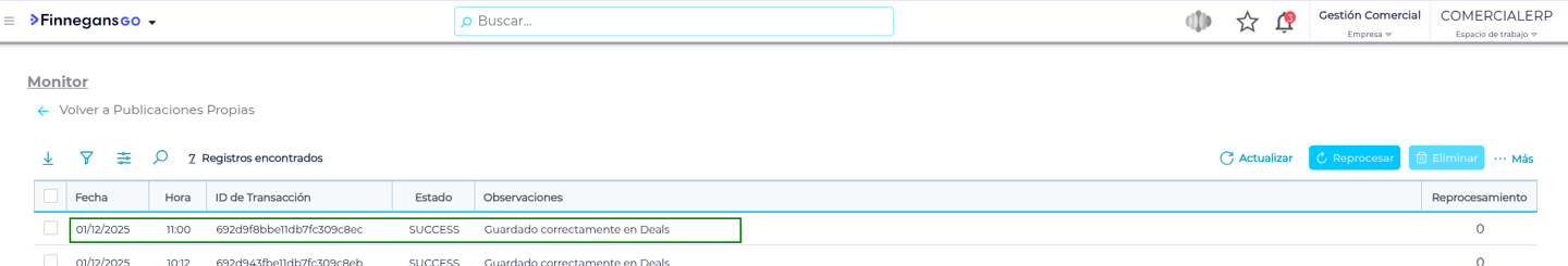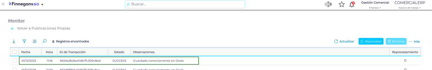 Ir a los 3 puntos y seleccionar “Ver en el Monitor”. Las descargas fueron correctas en Deals y la informacion fue enviada al Maestro de Clientes en el ERP: