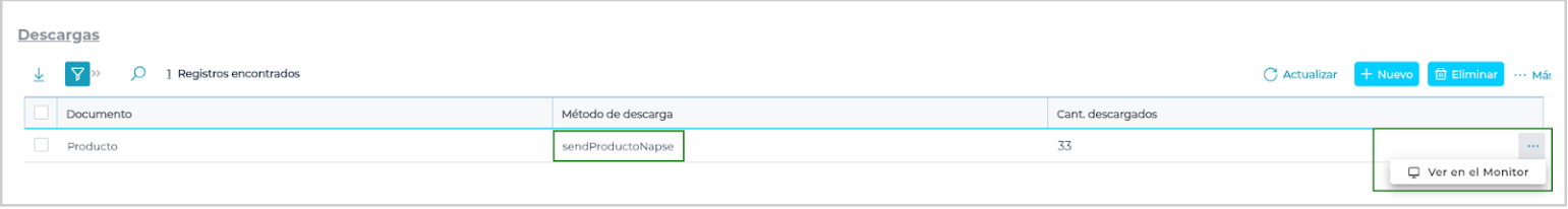 Ir a Menú > Deals > Descargas > Mis descargas > Buscar el código del método de descarga: sendProductoNapse > Ir a los tres puntos > Ver en el monitor: